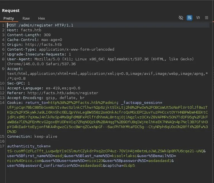 Creo una cuenta para ver los endpoints de registro e intercepto la peticion con burpsuite, pero no encuentro nada fuera de lo comun en un login, el post la ruta del endpoint y en el body de la peticion una cookie/session que en cada peticion se actualiza lo cual es el estandar de backend actualmente, seguido de los parametros con la informacion del formulario.