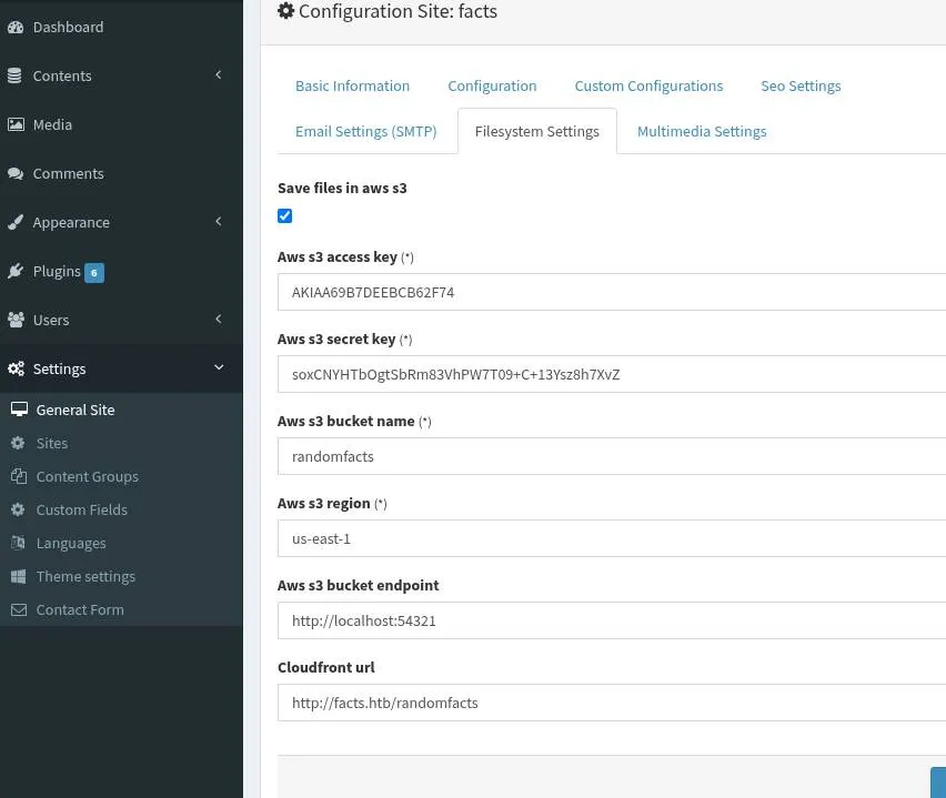 Buscando informacion en el panel de admin encontre credenciales de Amazon S3.