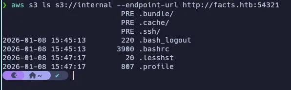 aws s3 cp s3://internal/ ./internal_files --recursive --endpoint-url http://facts.htb:54321Una vez descargado todo accedo al directorio .ssh que contiene credenciales. Por el momento ignoremos id.hash (que fue creado por mi con una herramienta), pero en id_ed25519 esta la clave privada de acceso mediante ssh.