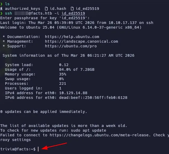 ssh-keygen -y -f id_ed25519Nos devolvera el usuario y ese es el que usaremos para acceder con la clave privada y obtendremos una shell.