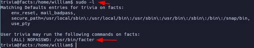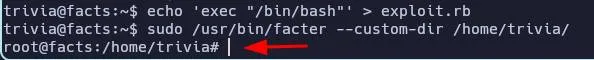 Buscando informacion facter muestra informacion de sistema, kernel, ip, etc. Como tiene permisos de root NOPASSWD podemos hacer uso de él para que ejecute un script en ruby para nosotros que inicia una bash, luego lo ejecutamos y listo tenemos acceso root.